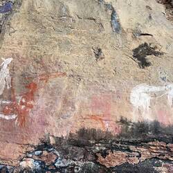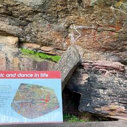 Zu sehen sind auch die Werkzeuge und Werkbänke der Aborigines in dem die Farben gemischt oder Nahrung zerkleinert wurde. Tiefengrabungen durch Archäologen zeigen eine Besiedlung bis vor 20.000 Jahren an dem Ort an und wir stehen mittendrin und zwei Meter vor den Felszeichnungen.