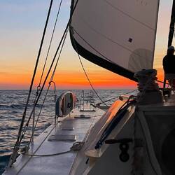 Durch das Fernglas kann ich einen hell erleuchtetes Kreuzfahrtschiff ausmachen, aber am AIS ist kein Signal zu entdecken. Ich wecke unseren Skipper Martin, er sagt mysteriös. Ein Musikdampfer hell erleuchtet ohne AIS fährt mit uns parallelen Kurs, ein wenig schneller als wir mit unseren 5,5kt Motorfahrt. Beobachten heißt die Aufgabe in der Nacht und bei Tageslicht sehen wir weiter.