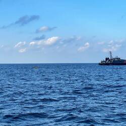 Neben uns auf hoher See springen hundert fliegende Fische von der VAVA-U weg und zwei Delphine begleiten uns.