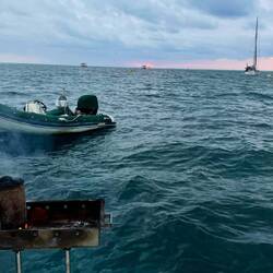 Nach der Rückkehr gibt es zum Kaffee noch einen Geburtstagskuchen und am Abend grillen wir am Heck Lammsteaks mit Zwiebeln und Offenkartoffeln.
