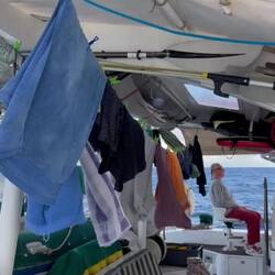 Das ist das Zeichen für Schleppangel, nach zehn Minuten ein sechs Kilogramm schwerer Thunfisch am Hacken und wir haben wieder zwei Fischmahlzeiten gesichert.