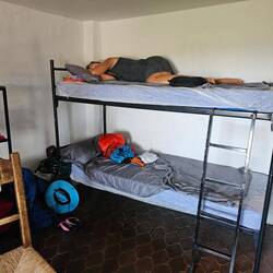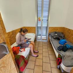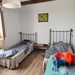 We're in a bigger albergue tonight holds 40+ but our room only has 8 beds. We'll see how the snoring goes...