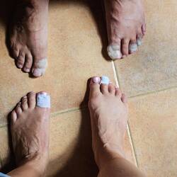 We walk 3 - 6 km to the next village to get coffee, OJ, and some food... hopefully. We then keep walking, and around 10ish, we stop at a bar/cafe to get a cold drink and a snack (or eat something we bought the night before). At this time, we kick off the shoes to let the feet breathe.
