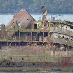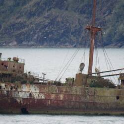 Die Route durch die teils sehr engen Kanäle ist an sich schon sehr abwechslungsreich. In der Nacht fuhren wir eine Weile am offenen Meer mit vergleichsweise niedrigen Wellen (3-4 m), also nur ein angenehmes Schaukeln im Bett. Zwei weitere "Highlights" waren das Ankern vor Puerto Eden, dem Minidorf (ca. 100 Einwohner) das nur über diese Fährverbindung Kontakt "nach Außen" hat und dem Wrack "Capitan Leonidas". Dieses Schiff ist auf ein bereits dort liegendes Schiffswrack aufgelaufen und bietet somit nicht nur ein hübsches Fotomotiv sondern auch auch ein geschichtsträchtiges nautisches Mahnmal.