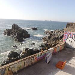 Die Hafenstadt Valparaiso ist sehr eigenwillig in seiner Architektur - durch seine Lage am Meer /auf den Hügeln sind manche Vierteil (nämlich die höher gelegenen) recht schwierig zu erreichen. Unsere Anfahrt mit unserem kleinen Racingcar war mehr als spannend - leider haben wir (noch?) kein Video davon. Jedenfalls steht unten an der Straßenkreuzung jemand mit einem "go-stopp"-Schild, damit es zu keinen unliebsamen Begegnungen am Weg bergauf oder -ab gibt.