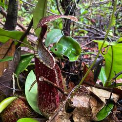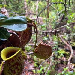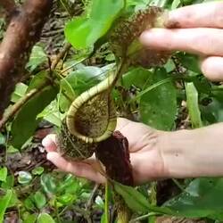 Heute starten wir früh. Mit Raymond und Uwa überqueren wir den Fluss und schlagen unseren Weg durch den Regenwald. Ziel sind Kannenpflanzen (fleischfressende Pflanzen). Bald werden wir fündig. Am Boden und als Liane wachsen die Kannen/Fallen. Wir wissen, dass in den höher hängenden Fallen Fledermäuse den Tag verschlafen. Nach einer Weile findet Uwa den Kriterien entsprechende Exemplare. Und tatsächlich schläft darin eine kleine Fledermaus. Da wir sie geweckt haben, fliegt sie aus, bevor wir ein Foto machen können. Bei einer zweiten Falle reichts dann für einen Video 🤩
