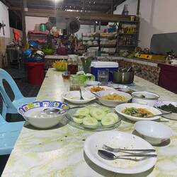Nach einem stärkenden Frühstück aus Fried Baan Hoon (gebratene Nudeln) werde ich von Hartmut ausgerüstet. Eine Machete gehört im Regenwald zur Pflichtausrüstung. Treckingschuhe sind unpraktisch, weil nicht rutschfest im nassen Regenwald und wie ich schon erfahren habe, trocknen sie sehr schlecht. Darum kaufe ich mir Bowlingschuhe. So nennen sie hier die Plastikschuhe mit Stollen. 😊