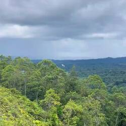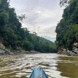 Leider ziehen ziemlich schnell Wolken auf und ein starker Wind kommt auf. Wir entscheiden uns umzukehren. Bei Wind und Gewitter im Regenwald zu sein ist wegen herabfallenden Ästen und umstürzenden Bäumen gefährlich. Auf der Rückfahrt werden wir dann doch noch kurz verregnet.
