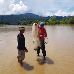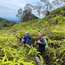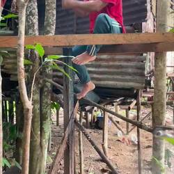 Nach dem Frühstück führt uns Marylin durch die Felder und den Wald hinter dem Dorf. Sie erklärt uns die Heilwirkung vieler Pflanzen. Von der Rinde gegen Kopfschmerzen über Blätter gegen Husten zu Blüten gegen Grippe/Covid. Das Highlight der Tour ist der Pfeilgiftbaum (Tajim), aus dem die Penan Gift herstellen. Dieses kommt dann auf die Pfeilspitzen womit mit den Blasrohren Tiere gejagt werden. Der Prozess ist aufwändig, erfordert weitere Zutaten und das Wissen wird nur innerhalb der Familie weitergegeben. Wir besuchen auf dem Rückweg ein Reisfeld und schauen bei der Aussaat zu.