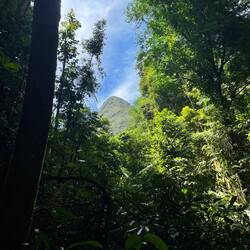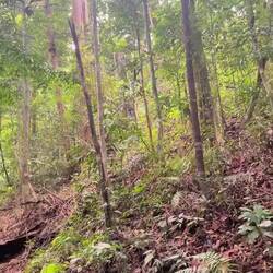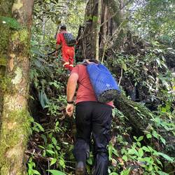 Weiter gehts durch den schönen Wald. Nach knapp 2h und einigen Höhenmetern müssen wir den selben Fluss nochmals überqueren. Hier oben ist es ein Bergbach. Kurz darauf, nach insgesammt 5.6 km, erreichen wir das Camp 1. Da wir gut in der Zeit liegen und kein Regen in Sicht ist, schlage ich vor bis zum Camp 2 zu wandern. Jimmy lässt sich schnell überreden. Was für eine gute Idee. Je weiter wir gehen, desto mehr grosse und alte Bäume hat es. Auch das Vogelgezwitscher nimmt zu. Kurz: mehr Urwald! Ab und zu öffnet sich der Wald wegen eines umgestürzten Baumriesen und gibt den Blick auf die bewaldeten Bergflanken frei. Wunderschön!