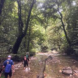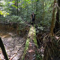 So starten wir um 8:30 unseren Daytrip bei tollem Wetter. Jimmy gibt ein gutes Tempo vor. Nach gut einer Stunde durch den Regenwald erreichen wir einen Fluss. Das Wasserlevel ist tief und wir können ohne Probleme queren. Dieser Fluss ist eine Schlüsselstelle: setzt Regen ein, kann er zu einem reissenden Fluss anschwellen, den man nicht mehr überqueren kann. Veno hat mich davor gewarnt. Ich habe für den Notfall meine Hängematte und Tarp dabei, sollten wir unplanmässig auf der andern Seite übernachten müssen.