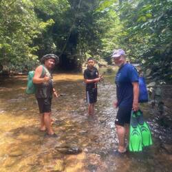 Als wir mit dem Boot nicht mehr weiterkommen, gehts zu Fuss weiter. Manchmal gehen wir nur knöcheltief im Wasser, dann wieder hüfttief. Eine schöne Flusswanderung. Das Ziel sind tiefere Becken weiter oben. Da wollen wir schnorcheln gehen. Eine kleine Harpune haben wir auch dabei, falls wir essbare Fische finden. 😊