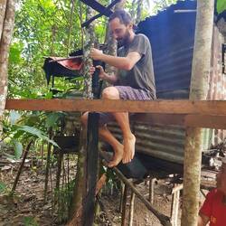 Nach dem Frühstück gehen wir zum Haus von Uwa. Er fertig ein Blasrohr an und wir dürfen zuschauen. Auf einem kleinen Gerüst sitzt er und bohrt das Loch von Hand ins rund 2m lange Holz. Er ist bald durch. Seit knapp zwei Wochen ist er bereits am Arbeiten, pro Tag aber immer nur 10min 😊 Die Penan verwenden für die Blasrohre Eisenholz, ein sehr hartes Holz. Ich darf auch ein paar Umdrehungen bohren. 😊