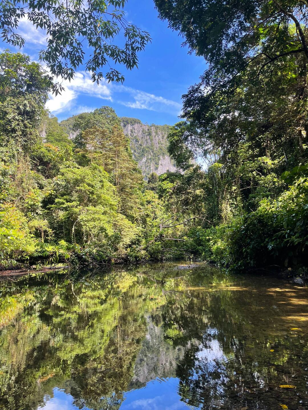 Zum Abschluss meiner Reise möchte ich soviel Regenwald und Nationalpark wie möglich erkunden. Für die Besteigung des Wahrzeichens des Mulu Nationalpark, den Gunung Mulu (Mount Mulu) benötigt man 4 Tage. Ich möchte aber in einem Tag zumindest Richtung Gunung Mulu wandern. Veno hat für mich seinen Freund Steve als Guide organisiert. Steve fällt aber am Morgen sehr kurzfristig aus, da er mit einer allergischen Reaktion erwacht. Kurzum organisiert Veno einen anderen Guide. Der Penan Jimmy ist Bootsführer, aber kennt den Weg zum Berg in- und auswendig. Jimmy spricht ein bisschen englisch, gehört aber in die Kategorie der ruhigeren Guides. 😊