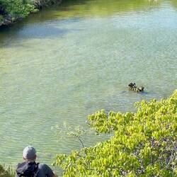 Am Strand angekommen, sichten wir wieder Marine-Iguanas. Dieses Mal können wir ihnen zuschauen, wie sie zurück über die Flamingo-Lagoon schwimmen. Sehr eindrücklich, wie diese sich im WasserLæs mere