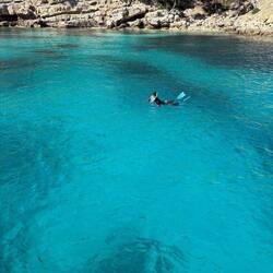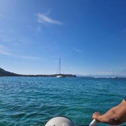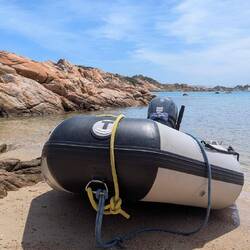 Our first stop is Cala Santa Maria. For some reason, anchoring is a complete mess. First we fumble around trying to decide where to drop the anchor, then we get pushed around by the not-so-strong wind, and I fail four times to hook the snubber onto the anchor chain. We look like amateurs 😅 Or like one of the many charter boats that are here in large numbers. In this bay—where one tourist boat after another docks and departs—we wait out one more night of strong wind before enjoying the paradise around us the next day. We take the dinghy to shore and head toward a path that’s supposed to lead to an even more beautiful spot. It turns out to be private property, so we make our way back through the crispy, sunburned tourists on the beach. We put the engine on the dinghy and buzz off to our own little piece of paradise.