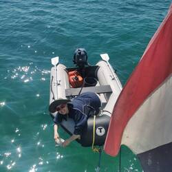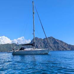 We vinden een mini stukje strand en er dobbert 1 motor bootje in het kleine baaitje. Het blijkt een Nederlands stel te zijn die voor een dag met een schipper op pad zijn, Viola en . We hebben een leuk gesprek, wij in het water en zij op hun bootje. We maken nog wat fotos van elkaar vanaf een afstandje en zwaaien ze dan gedag. We hebben onze sv_nimrod instagram met ze gedeeld en de volgende dag krijgen we nog een heleboel foto's en filmpjes van onze Nimrod toegestuurd. Ze zijn de baai in gegaan om Nimrod eens te bekijken. Wij genieten nog van onze borrel op het strand voordat we weer richting huis gaan.