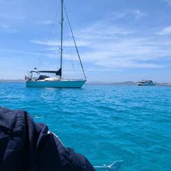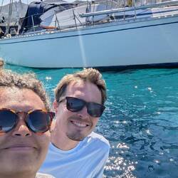 We find a tiny stretch of beach with one small motorboat floating in the bay. It turns out to be a Dutch couple out for the day with a skipper—Viola and [name missing]. We have a fun chat, us in the water and them on their boat. We snap some photos of each other from a distance and wave them goodbye. We had shared our sv_nimrod Instagram with them, and the next day we receive a bunch of photos and videos of our Nimrod. They had cruised into the bay for a closer look. We enjoy a little aperitif on the beach before heading back home.
