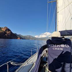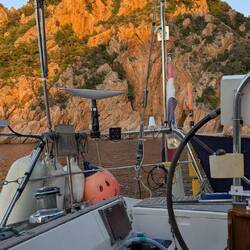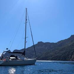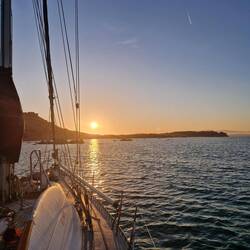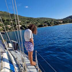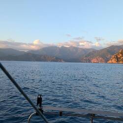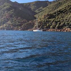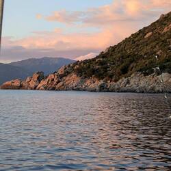 Wat een heerlijke zeiltocht was het van Ajaccio naar Campomoro. Om de baai uit te komen en vervolgens linksaf te kunnen moesten we eerst nog een paar extra slagen maken. Later op de dag zou de wind gunstig draaien en dat deed ze! Eerst een heerlijke 15 knopen ruimwindse koers en vervolgens hebben de boom gezet om melkmeisje te varen aangezien de wind helemaal van achteren kwam. De eerste paar keren zaten we steeds flink te klungelen om die boom goed te krijgen maar ondertussen hebben we het trucje door. Bevestigen aan een val, Bart met boom naar voren, ik met boom naar achteren, Bart zet m vast in de fok, ik op de mast en uitrollen maar 💨