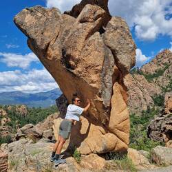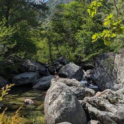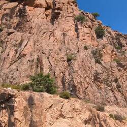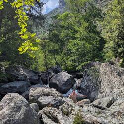 Via de universiteit en het oude centrum, inclusief de citadel, zijn we naar de Tavignanovallei gelopen. Hier heeft blijkbaar vroeger ooit een gletsjer gestroomd, nu is het een heerlijke rotsachtige rivier. Het was een prachtige dag en opnieuw best een stevige wandeling dus de verleiding om in het water te springen was groot. We stelden het nog even uit, en vulden eerst maar eens onze bidons en Bart bekeek het damwerk van voorgaande wandelaars. Op een gegeven moment kwamen we op een verlaten stuk rivier inclusief een paar inimienie watervalletjes. Een top plek. Dus hup uit de kleren een heerlijk afkoelen. Lekker om weer eens in zoet water te spelen inplaats van de zoute zee.
