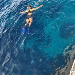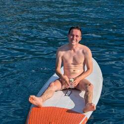 Tijd voor mij om te snorkelen en Bart om te suppen. We hangen onze door de zon voorverwarmde douchezak op, shoutout naar Eef, nemen een lekkere warme douche en zoeken vervolgens het plekje in de zon aan boord op. Aangezien er niemand te bekennen is hebben we geen zwembroek of bikini nodig😉