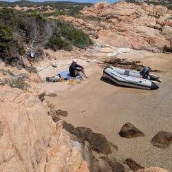We hebben weer een mooi plekje gevonden en vanaf hier kunnen we ook met de dinghy naar een supermarkt en een poging doen om ons vuilnis weg te gooien. De dinghy kunnen we stiekem aanleggen in de Marina aan het eiland aan de andere kant van de baai. We hadden al gelezen dat het weggooien van vuilnis lastig kan zijn op Sardinië. Nou dat hebben we gemerkt. We hebben zeker 20 minuten rondgelopen en geen vuilnisbak gevonden. Alleen een paar voor hondenpoep zakjes en een aantal containers die eruit zien alsof ze al in geen jaren geleegd dan wel geopend zijn. Uiteindelijk vinden we op een verlaten boot/industrie terrein een puinzooi container waar we besluiten het vuilnis te laten.