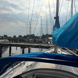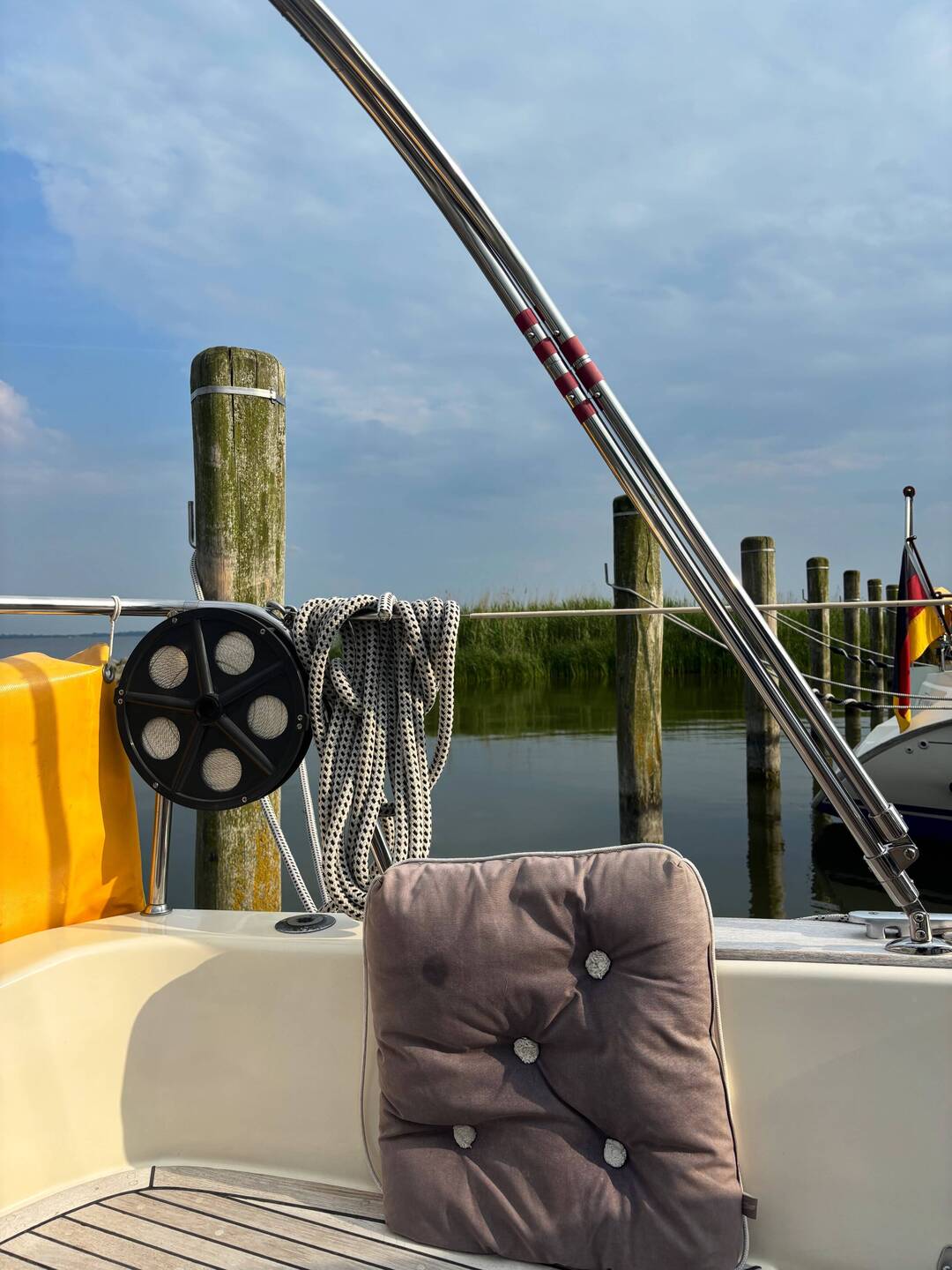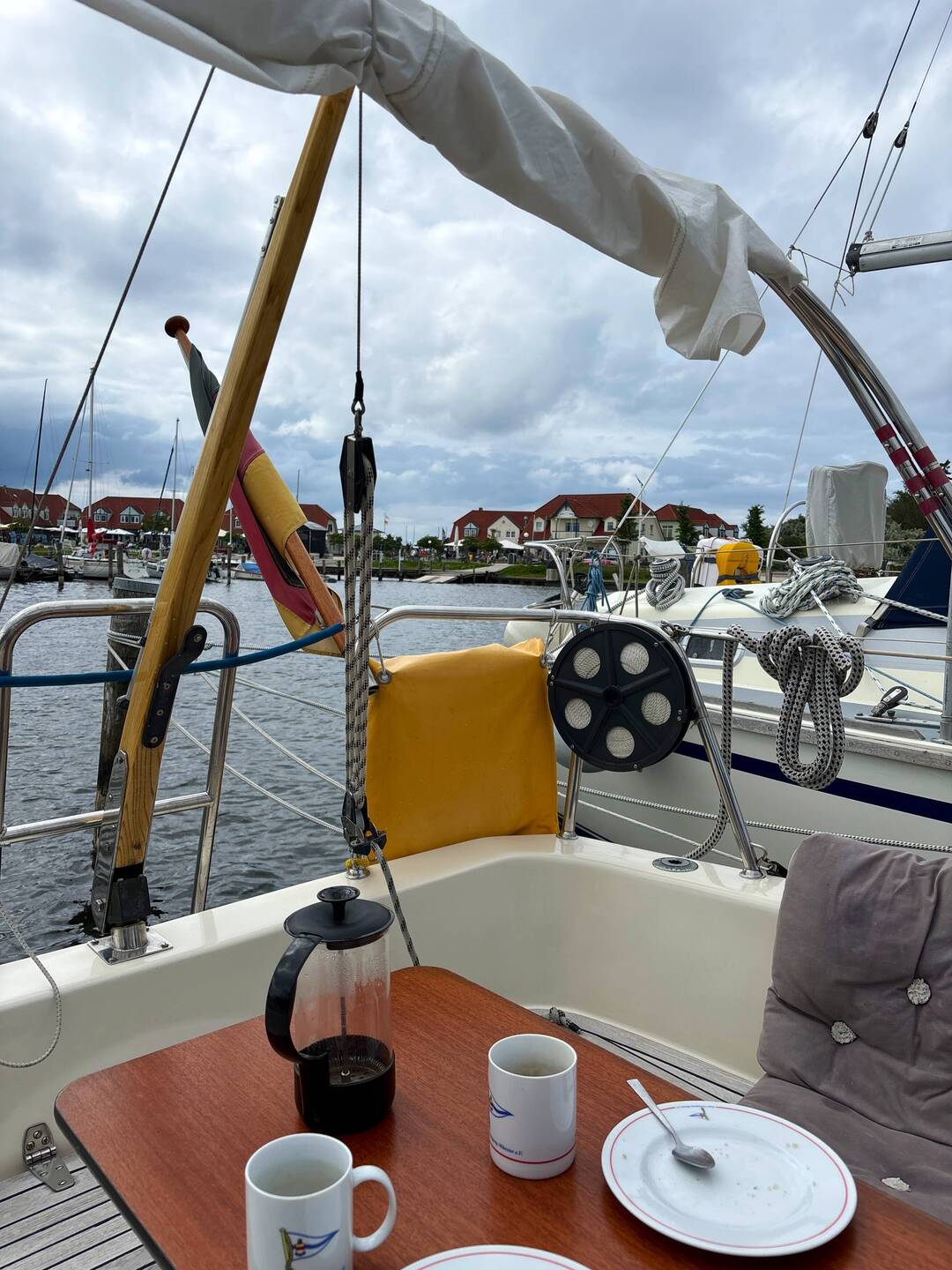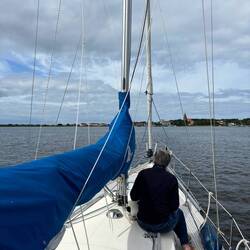 Weil das Wetter so bescheiden war und viele Regenwolken am Himmel hingen, entschieden wir uns, unsere Kuchenbude beim Segeln mit der Fock stehen zu lassen.