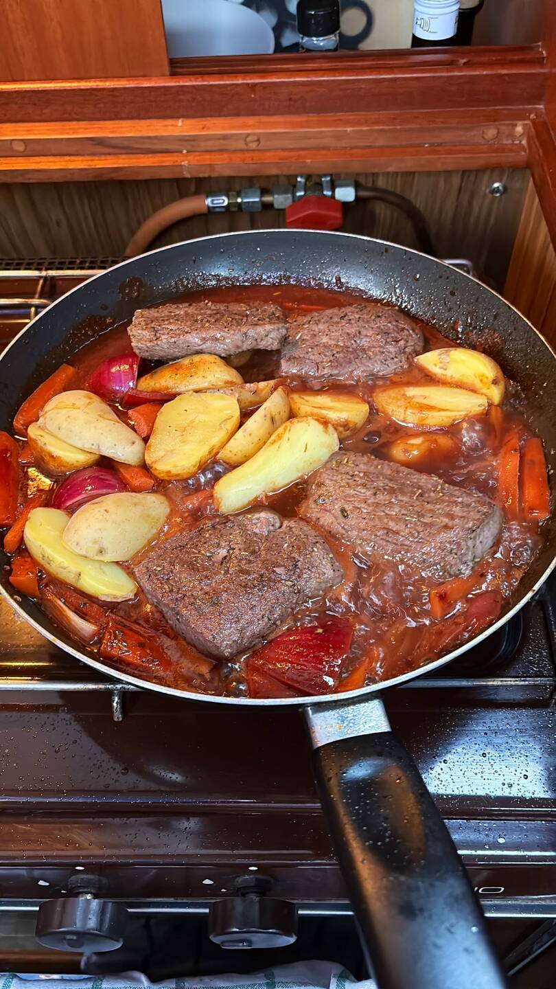 Abends ganz besonders lecker an Bord gekocht. Es gab Lammlachs geschmort mit Möhren, Zwiebeln, Kartoffeln und Cherrytomaten in Rotweinsud.