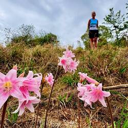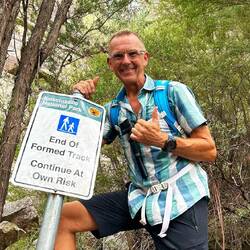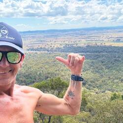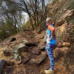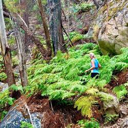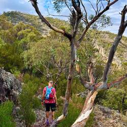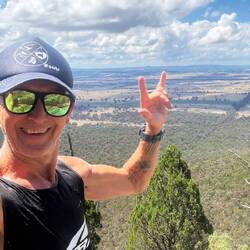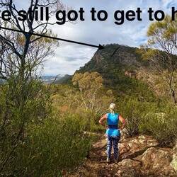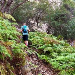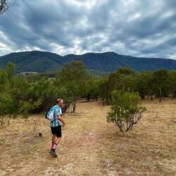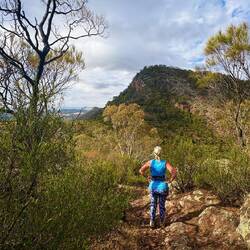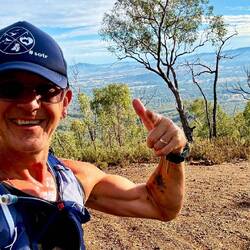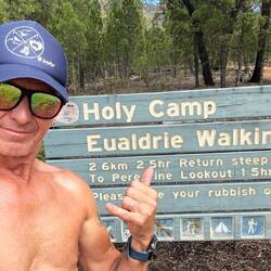 Starting at Holy Camp, he followed an old logging track to the base of the mountains then up a steep climb to Peregrine Lookout, across to Eualdrie Lookout and down through rugged terrain, ridges and deep gullies to Ben Halls Campground. Then he did it all again in reverse- a total of 13km and 758m elevation.