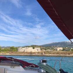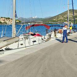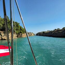 Strahlender Sonnenschein, der Wind meinte es gut, blies mit vier Windstärken aus halbwegs segelbarer Richtung daher und trieb uns Richtung Kanal von Korinth. Dort angekommen stand Wind und Wasserstömung gegeneinander, was das Anlegemanöver ziemlich tricky gestaltete. Unbekanntes Boot, unbekannte Drehrichtung der Schiffsschraube und unbekannte Wirkung des Bugstrahlruders verlangte mir beim Anlegen viel ab. Stolz brauch ich auf dieses Manöver beim besten Willen nicht sein, aber mit viel Hilfe vom Kai schafften wir es dann doch an den Pier. Danke Leute!
