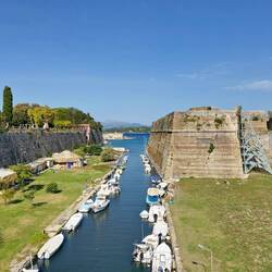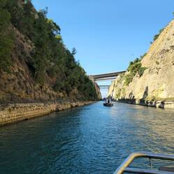 Der Kanal, 6346m lang, 1881-1893 unter der Aufsicht ungarischer Ingenieure gebaut, durchschneidet bei Isthmus am Ostende bzw. Korinth im Westen die Engstelle zwischen dem griechischen Festland und der Halbinsel Peloponnes.