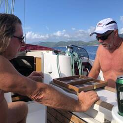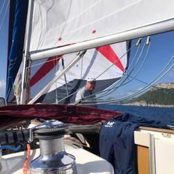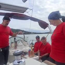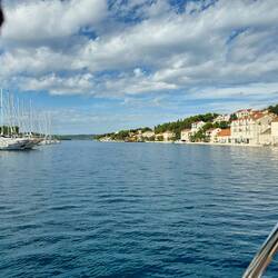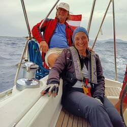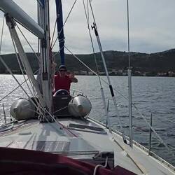 Unterwegs, Moni war am Steuer, trafen wir vor Biograd auf etliche Schulungsboote diverser Skippertrainings, alle größer und auch moderner als unsere "Ostbahn". Stef, der alte Schotenzupfer trimmte die Segel perfekt und keines der Boote hatte eine Chance gegen uns!