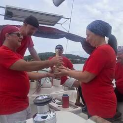 In der Barotul vor Anker kramte ich den Sekt aus der Kühlbox und nach einer kleinen Ansprache meinerseits hatten dann Moni und ich gemeinsam unser Boot auf den neuen Namen getauft und es ordentlich mit Sekt übergossen!