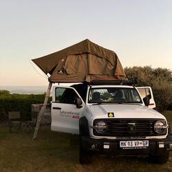 Gegen 18 Uhr erreichten wir unseren ersten Campspot. In Südafrika ist wildes Campen nicht erlaubt, jeder offizielle Platz ist eingezäunt – was ein beruhigendes Gefühl gibt. Wir bauten das Dachzelt zum ersten Mal auf und erkundeten das Auto und seine Utensilien.