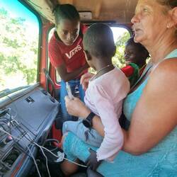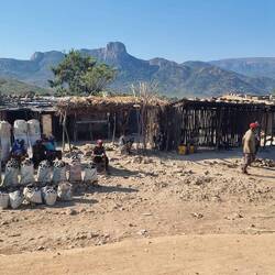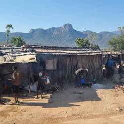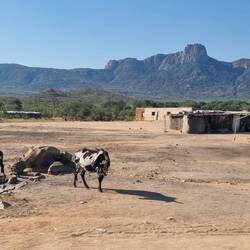 Es geht zurück über Namibe und dann Ostwärts Richtung Lubango, immer den Bergen entgegen. Vorerst ist es vorbei mit Wüsten Landschaft. Mit den Bergen wird es wieder grüner und den einfachen Bambushüttwn weichen Kehm- oder Blechhütten. Am Fußes des 2000m hohen Paßes wollen wir einen Locals mitnehmen, der am Straßenrand nach einer Mitfahrgelegenheit sucht. Doch er hat seine ganze Familie dabei! Das "only one" von Julia, will er nicht verstehen. Zunächst kommen die ältere Tochter, dann kommt der Sohn auf Julias Schoß um noch Platz für die Mutter mit dem Baby zu finden. Zumindest der Papa bleibt drausen. Na ja, jeden Tag eine gute Tat!