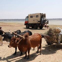 Unsere Route führt uns weiter in östlicher Richtung. Wir starten früh um heute Kilometer zu machen. Es geht ständig bergauf auf bis zu 2000m und wieder runter auf 1300 m. Die Straße wechselt von neu auf Schlagloch Slalom oder Baustellen Umleitung. Bei einer kurzen Mittagspause an einem See kann ich meine Suhaeli Sprachkenntnisse voll anbringen. Der Bauer erzählt mir, dass er für seine Ochsen Erde mit Mineralstoffen für seine Rinder aus dem See holt und es ihnen unter das Futter mischt . Auch erfahre ich was seine beiden kleinen Ochsen wert sind. Tja, Sprachkenntnisse sind schon von Vorteil!
