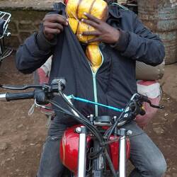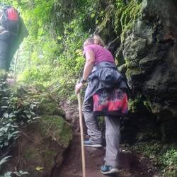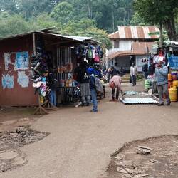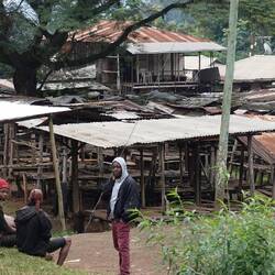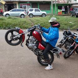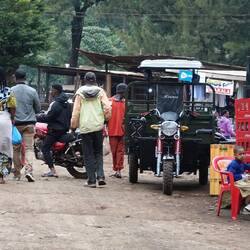 Am nächsten Tag holt uns Jimmy unser guide pünktlichst um 12.00 Uhr ab. Das sind wir in Afrika nicht mehr gewohnt und darum sind wir auch noch nicht startbereit. Wir gehen mit ihm zunächst in Richtung Village zu einem Wasserfall. Der sollte 20 $ Eintritt pro Person kosten, was uns viel zu viel ist. Für den Victoria Fall haben wir auch nur 20 $ bezahlt! Wir verhandeln und bekommen 10$ Nachlass für 270 Stufen bergab und einem 35 m hohen Wasserfall. Frau Emms ist sauer, wobei hier nicht das suhalische "sauer" gemeint ist, den das bedeutet soviel wie OK. Jimmy versprach uns gestern einen View Point mit Blick auf Kenia, Arusha und den 3 höchsten Berg der Gegend. Die 3 km dorthin will Julia laufen. Kurz vor dem Ziel kommen wir am Straßenrand an eine weiteren, nett hergerichteten Mini Wasserfall aber Bar vorbei. Das Geld reicht noch für zwei Bier und ein Cola für unseren Führer. Also verzichten wir auf den view, ist eh bewölkt und trinken lieber ein Bier. Ein BodaBoda Fahrer lässt mich seine 150 chinesische Boxer testen. Die gehen gar nicht mal sooo schlecht. Kein Wunder, müssen die Mopeds ja teilweise 4 Personen oder Unmengen von Kohlesäcken oder Wasserkanister schleppen. Für den Rückweg nehmen Daladal, eines der kleinen Sammeltaxis mit den verrückten Fahrern. Zum Schluß zähle ich 17 Leute einschließlich Fahrer und ein Kleinkind in dem Toyota Bus in der Größe eines langen VW Buses. Der Fahrer ist nur fürs fahren und Hupen zuständig. Die Fahrgäste in den Kleinbus mitsamt Gepäck zu verstauen und das Geld ein zu sammeln ist der Job des an der Schiebetür hängenden Co Piloten, der immer den Kopf drausen hängend nach neuen Fahrgästen Ausschau hält. Dafür gibt es keine festen Stationen, aus und einsteigen gejt wo immer man will. Kurzstecken kosten 500 Schilling ca. 18 Cent. Das steigert sich je nach Entfernung, wie genau weiß wahrscheinlich keiner so genau. Wieder lebend im Village angekommen machen wir noch einen Rundgang durch den Markt, bevor wir uns zwei BodaBoda chartern um den steilen Weg zum Coffee Tree Camp nach den ohnehin schon 12 km Fußmarsch uns zu erleichtern. Jimmis Freund mit seinem Moped ist auch da und so fährt Julia mit so einer chinesischen Rakete als Sozia mit und ich fahre selbst mit Jimmy als Sozius hinten drauf. Bergauf überholt uns das andere BodaBoda, das hätte er nicht tun dürfen. In der nächste Kurve habe ich ihn aber schon wieder, sehr zum Leidwesen von Jimmy, der sich mit aller Gewalt nach außen lehnt! Am Camping Platz angekommen muss Jimmy schnell auf Klo, wobei ich mir nicht sicher bin, ob es nicht schon zu spät dafür ist!