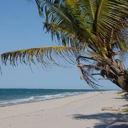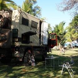 Wir fahren durch eintönige Landschaften mit links und rechts nur dichten, teilweise abgebrannten Busch. Eine kleine Pause zu Mittag bei einem Berg, der aussehen soll wie ein alter Mann, vertreten wir uns wenigstens etwas die Beine. Nach der Warterei an der Grenze habben wir ohnehin beschlossen eine Grenze uns zu ersparen und Simbawe zu kippen. Stattdessen wollen wir in Mosambic nochmal ans Meer schnorcheln. Dafür fahren wir heute 300 km, davon die letzten 60 km auf völlig zerstörten Straßen. Dort wo der Asphalt gar nicht mehr existiert, lässt es sich noch am besten fahren, den die Schlaglöcher, sind selbst für unseren Truck, mit den 4-fach verstärkten Federn zu tief. Bei Sonnenuntergang finden wir unweit von der Hauptstraße einen Schlafplatz in einem erst vor kurzen durch ein Feuer erheblich reduzierten Waldstück. Für eine Nacht geht das schon. Wir grillen Steaks, Holz und Holzkohle liegt ja genügend rum. Ein hastig vorbeifahrender Radfahrer ignoriert uns, genau so wie am nächsten Morgen alle möglichen Menschen die entlang des Weges an uns vorbei schlendern. Dafür geht es morgen früh weiter. Es sind nur noch gut 200 km bis zum Meer und die Straße wird wieder gut, so dass wir gegen Mittag bereits das Meer sehen.Leer más