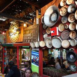 Abends verlassen wir dann noch einmal unser geschütztes Gefängnis um zu Fuß zu einem 2 km entfernten Kaffee mit live Musik zu laufen. Die Location entpuppt sich als der Hit überhaupt: Eine wild zusammen gewürfelt und ineinander verschachteltes Sammelsurium aus der Musik-, Kunst-, und Kulturszene. Es gibt gute Armateur live Musik, so dass wir beschließen den Fisch der im Kühlschrank liegt, Fisch sein zu lassen und dafür eine dicke Pizza mit Bilton und Käse reinziehen und nicht nach Hause zu gehen. Erst nach 20.00 begeben wir uns zu Fuß auf den nach Hause Weg. In Deutschland ja überhaupt kein Problem. Hier aber Sonnenuntergang um 17.30 Uhr, kein Mensch mehr auf der Straße, die Häuser mit hohen Mauern geschützt und wir als Weiße alleine und verlassen dazwischen. In Nordafrika würde man jetzt "In sha Allah" sagen, was die hier in so einem Fall sagen weiß ich nicht!
