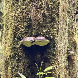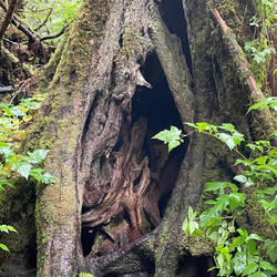 Es gibt im Regenwald sogenannte „nursing logs“, das sind Baumstämme, auf denen andere Pflanzen wachsen. Nicht nur Moose und Pilze wachsen dort, sonder auch Sträucher, manchmal Bäume. Ich habe einen Baum gesehen, der im Stamm eine Art Höhle hatte und das Holz war darin anders gefärbt als der Rest: das war der ursprüngliche Nursing-Log, der nun im Inneren des neuen Baumes weiterhin existiert.