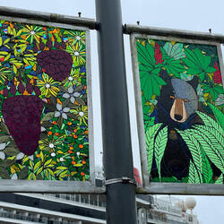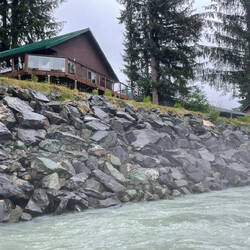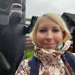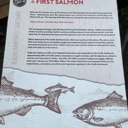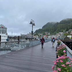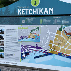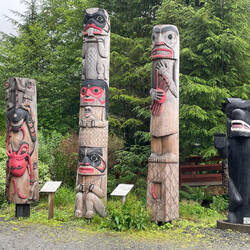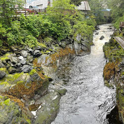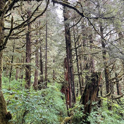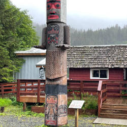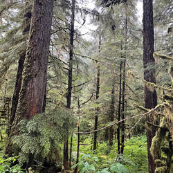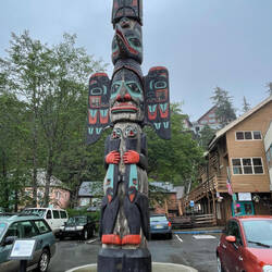 Sie erzählte uns auch über das Wetter in Ketchikan. Im Winter ist es recht mild, Temperaturen meist über 0 Grad und wenig Schnee, dafür viel Regen (noch mehr?🙄) und Sturm. Wenn es so windig ist, passiert es immer mal wieder, dass große Bäume sich nicht mehr halten können und umgeblasen werden. Das liegt an dem flachen Wurzelsystem. Die Erde in Alaska ist die reichhaltigste der Welt, jedoch hat man nur 2 bis 4 Fuß Erde und dann kommt harter Steinboden (bedrock). Die Bäume müssen also in die Breite wurzeln und nicht tief.