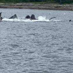 Aber es hat sich gelohnt: Vor der Insel waren 10-12 Buckelwale und haben „bubble net feeding“ gemacht. Sie bilden einen Kreis um einen Fischschwarm. Der größte Wal, in der Regel das Leitweibchen, taucht unter und bläst Luftblasen von unten hoch, so dass die Fische verwirrt sind und eine Barriere entsteht. Und dann machen alle Wale ihren Schlund auf und essen die Fische. Man sieht dann, wie alle Wale in einem Kreis gemeinsam mit dem Kopf auftauchten.
