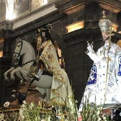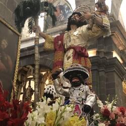 Schließlich besuchten wir noch die Kathedrale von Cusco. Leider waren wir auch da an der Grenze unserer Aufnahmefähigkeit. Die Kathedrale ist aber unglaublich reich: es hängen monumentale Bilder im großen goldenen Rahmen und alles ist mit Blumen geschmückt. Aufgrund des Festes der Wintersonnenwende (das ist quasi Silvester für die Südamerikaner) sind viele heilige Statuen von ganzen Land grade in der Kirche.