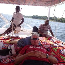 We had a slower start, and drove to the felucca, a type of sailboat active on the Nile River. We were divided into two groups, and each felucca had two men who worked it, moving the sail back andLæs mere
