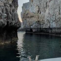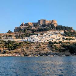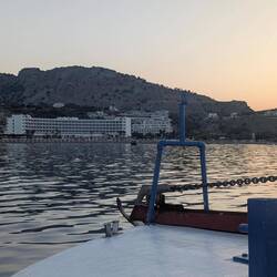 Um 19 Uhr starten wir mit dem Schiff von "Lindos Sea Cruises". Es geht Richtung Lindos, das im warmen Abendlicht romantisch angeleuchtet ist. Weiter geht es in die St. Pauls Bay und um die großen Felsen dort herum.