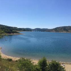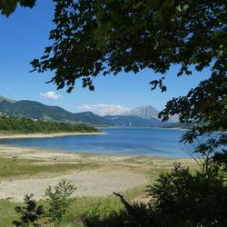Dann endlich, der erste Blick auf dem See. Wenn man den grandiosen Anblick des blauen, glitzernden Lago in sich aufnimmt, glaubt man kaum, dass hier einmal im großen Stil Torf abgebaut wurde. So um 1930 wurde dann dieses Becken geflutet und ein weitläufiger Stausee angelegt, der auch zur Stromerzeugung genutzt wird. Der See steht unter Naturschutz und ist Teil des Nationalparks Gran Sasso e Monti della Laga. An manchen Stellen erheben sich steile und bewaldete Hänge aus dem See, an anderen Stellen befindet sich ein sanfter Strand. Wer die Zeit hat, sollte auf jeden Fall den Monte di Mezzo mit ins Besuchsprogramm aufnehmen. Dort gibt es eine geniale Aussicht über den See und zum Grand Sasso und dessen Corno Grande. Aber Vorsicht, man sollte sich vorher genau erkundigen. Zum Gipfel führt sowohl ein relativ leichter als auch ein deutlich anspruchsvollerer Weg. Letzterer setzt Schwindelfreiheit, Trittsicherheit, Orientierungsvermögen und Klettererfahrung voraus. Der Einstieg ist etwas unterhalb des Dorfes in einer Linkskurve. Wir entschieden uns diesmal gegen eine „Gipfelerstürmung“, schließlich stand für heute eine Radtour auf unserem Plan.