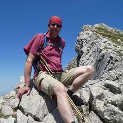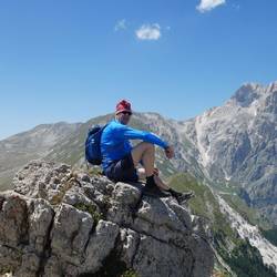 Der Anstieg ist wirklich sehr steil und kräfteraubend, dennoch aber recht gut zu gehen. Manchmal musste ich die Hände zu Hilfe nehmen, um einzelne Felsen zu überwinden. Nicht immer ist der Weg eindeutig markiert. Ich schaute oft zurück und staunte darüber, wie viel wir schon an Höhe gewonnen hatten. Wir kamen ganz schön ins Schnauben und machten die eine oder andere kleine Pause. Die Sonne brannte mittlerweile erbarmungslos auf uns herab. Mit uns waren viele Italiener unterwegs. Endlich kamen wir an einer schönen Stelle an, die zu einer größeren Pause einlud. Flach und grün sowie mit ein paar passenden Felsen zum Setzen. Hier hat die Natur an den Menschen gedacht und mal eben einen natürlichen Picknickplatz eingerichtet. An diesem Punkt gab es auch etwas zum Schmunzeln. Die Italiener, die hier Pause machten, waren mit bunten Regenschirmen unterwegs. Sie saßen zusammen, teilten sich ihre Köstlichkeiten und genossen - geschützt vor der Sonne durch ihre Regenschirme - die Landschaft. Schon eine besonderer Eigenart, mit dem Regenschirm in der Hand einen Berg zu ersteigen. Wie ich später erfuhr, wollten sie aber nicht alle zum Gipfel, sondern einfach nur etwas Bergwandern. Wir atmeten durch, tranken Wasser und stiegen weiter bergauf. Immer den Blick zum Gipfel gerichtet. Oben angekommen, hatten wir wie erhofft eine sehr gute Fernsicht. Wir konnten nicht nur tief ins Tal blicken, sondern auch in der Ferne die Adria erkennen. Mir verschlug es die Sprache.