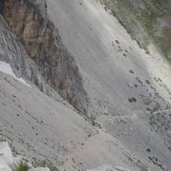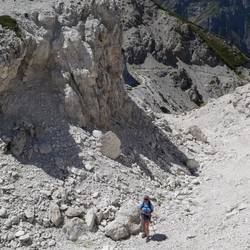 Es reicht, wenn man bis zum Kamm wandert, also auf eine Höhe von etwa 2.470 m. Will man höher hinaus, sollten die dort lauernden Gefahren nicht unterschätzt werden. Diese zeigen sich insbesondere beim Abstieg. Hier sollte man sich exakt an die Markierung halten und den einigermaßen fest getretenen Weg nicht verlassen. Ansonsten kann man auf den losen Geröllflächen schnell den Halt verlieren. Wir mussten mehrmals die Luft anhalten, weil Wanderer auf dem Geröll ins Rutschen kamen. Abschürfungen und Prellungen waren die Folge. Die in solchen Situationen immer wieder zu beobachtende große Hilfsbereitschaft unter Bergfreunden trug dazu bei, dass die entstandenen Blessuren gleich vor Ort behandelt werden konnten. Eine beruhigende Erfahrung. .