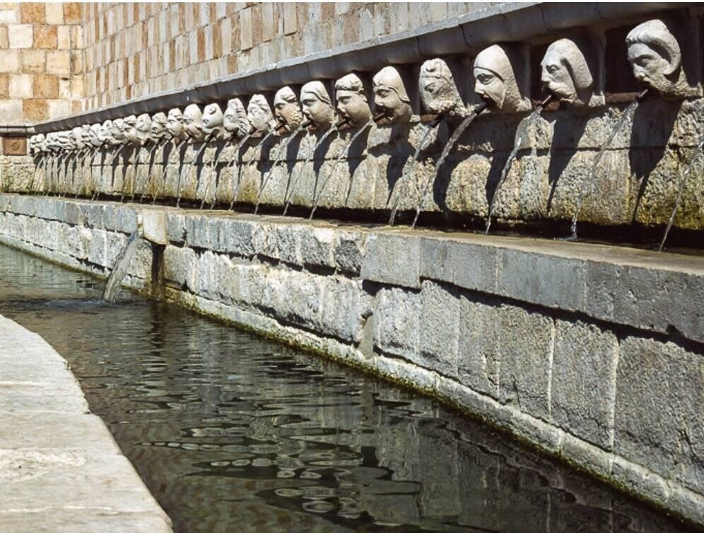 Ein weiterer Höhepunkt ist der Fontana delle 99 Cannelle, eine wunderschöne Brunnenanlage, die symbolisch für die 99 Dörfer der Umgebung steht. Hier können wir eine Pause einlegen und das Plätschern des Wassers genießen.