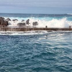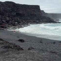 Wir erreichen die Playa del Paso, wo der schwarze Sandstrand zwar nicht zum Schwimmen einlädt, aber ideal für eine kurze Pause ist. Hier, umgeben von den Felsen, genießen wir den Anblick des tobenden Meeres.